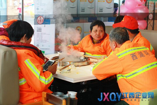 江西企业网讯(杨欢)继小编跟踪报道公益事件第三篇,江西苏宁2月14日在恒茂梦时代广场华神龙火锅店举办了一场别开生面的公益启动仪式。一并邀请了新浪江西、江西苏宁及媒体新闻朋友。14日当天小编也受邀共同参与这个公益活动中,一起与愿意奉献爱心的社会人士共同关注环卫工人。与此同时,新浪江西连续3天发起微博话题讨论,关注苏宁“#1个行动1个爱心#关爱环卫工人行动,宣布启动2015年针对环卫工人的无偿服务计划,江西苏宁承诺在全省30家门店免费为环卫工人提供热饭、开心、休息以及免费清洗油烟机、空调等服务。
